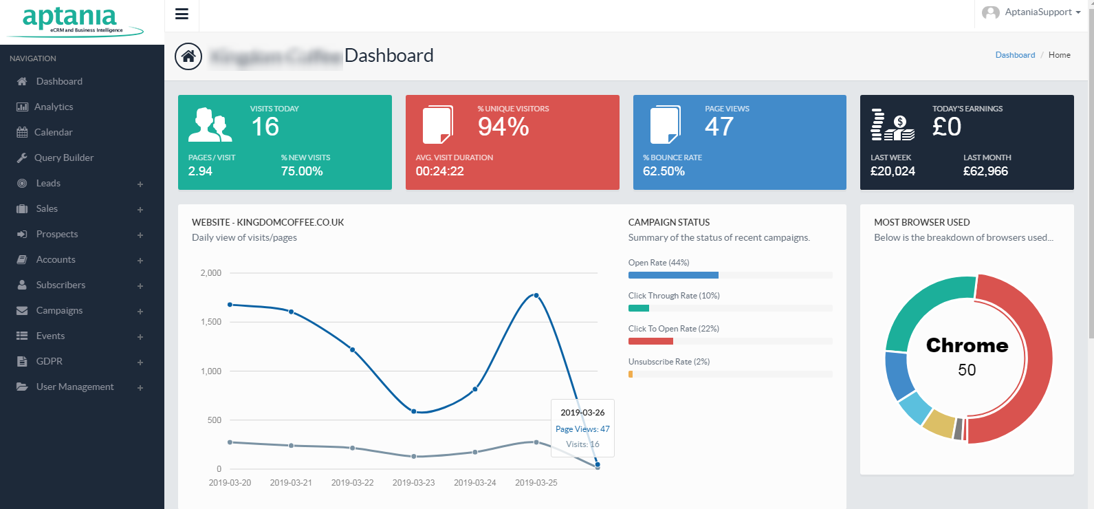 Our sales and marketing dashboard allows you to track your web traffic, email marketing activity, business leads and CRM metrics in one view. Get one view on how your B2B and B2C channels are perfoming both online and offline.
